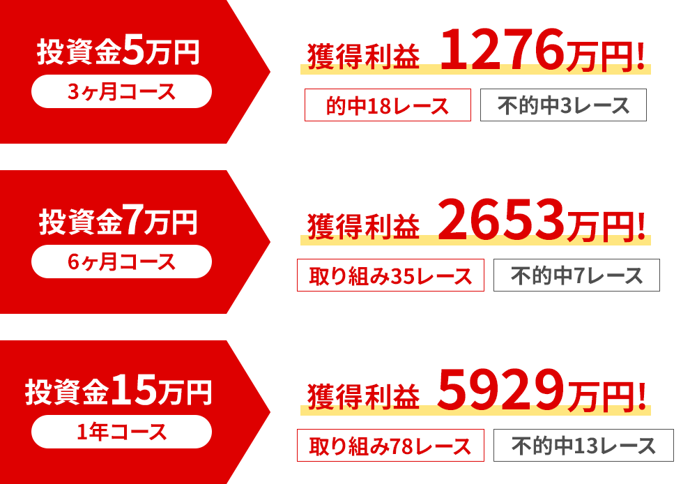 こちらは高い利益率が大きなメリットですが、その分的を絞った買い目となりますので 必ず想定通りの結果が得られる保証はありません。